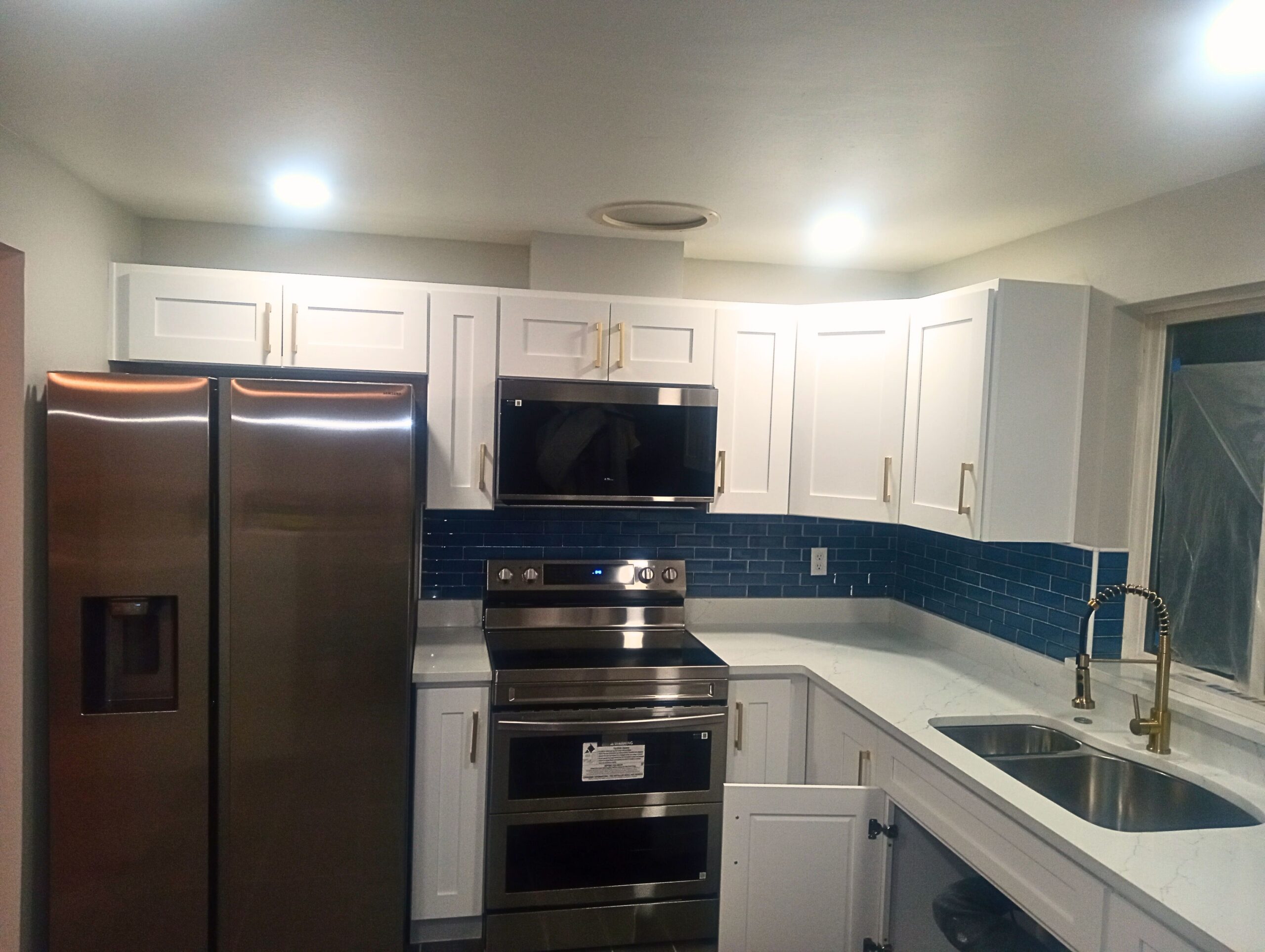 A complete modern remodel featuring a navy designer kitchen, sleek tile flooring, and recessed LED lighting, transforming a dated interior into a polished, contemporary home.