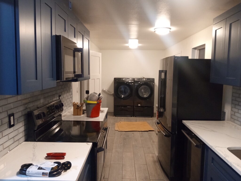 A complete modern remodel featuring a navy designer kitchen, sleek tile flooring, and recessed LED lighting, transforming a dated interior into a contemporary home.