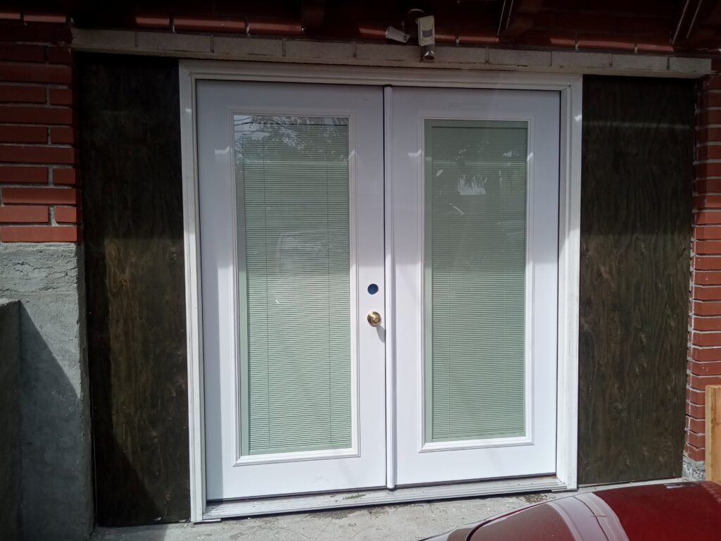 A structural entryway renovation featuring modern doors with integrated blinds. This project included professional drywall and custom dark wood trim.
